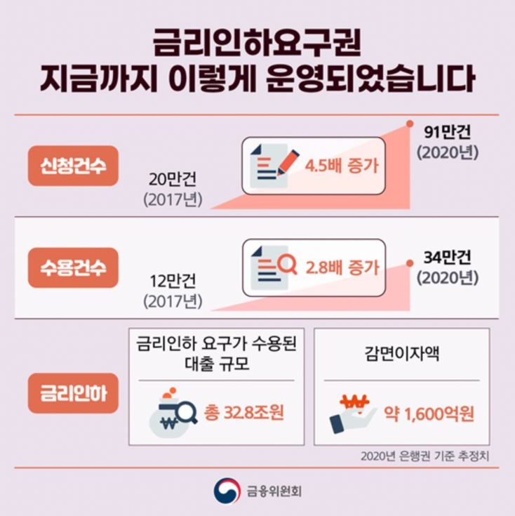 금리인하요구권이 접수되면 금리인하 여부는 해당 금융회사의 금리산정방법 등을 고려하여 결정됩니다. 한 번 더 말씀드리지만, 금리인하요구권은 대출자가 당당히 신청할 수 있는 권리입니다.